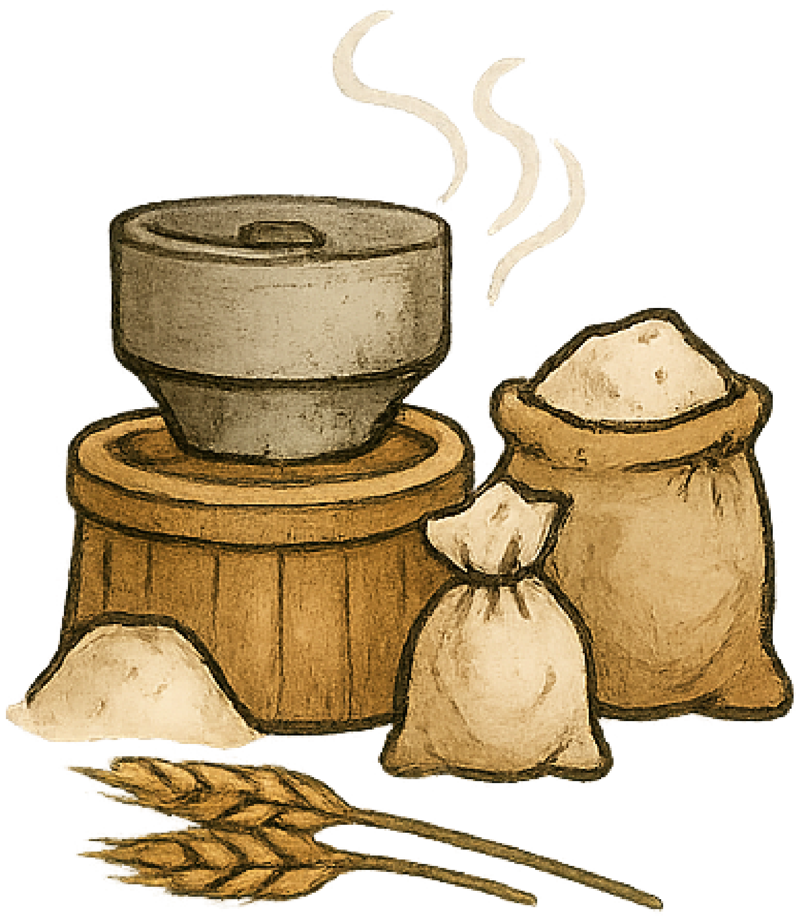Allt vi skördar tar vi hand om på gården. Efter tröskning, torkar vi spannmålen till lagringsbar vattenhalt. Säden förvaras sedan i vår ”spannmålstork” i stora ”fickor”. På gården har vi stenkvarn och virvelkvarn. När vi ska mala till siktat mjöl eller till lite grövre fullkornsmjöl tar vi hjälp av andra, större kvarnar. Flingor gör vi på gården, då blötlägger vi hela kärnor under ett antal timmar sedan plattar vi till kärnan så det blir flingor.