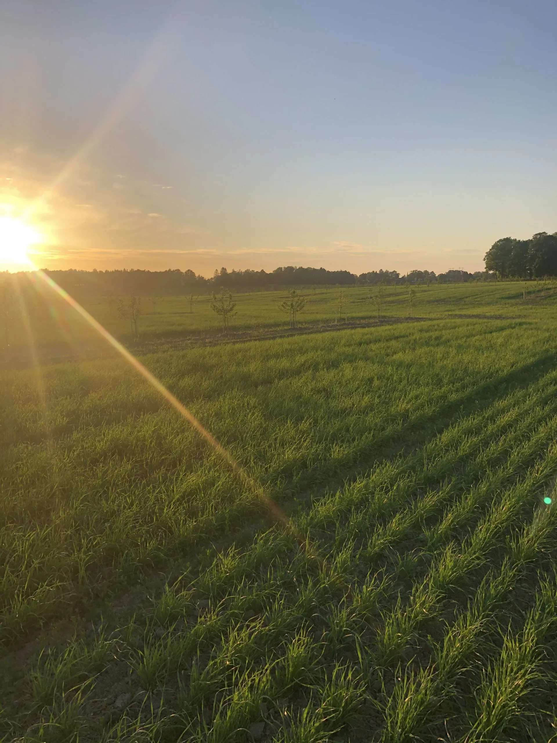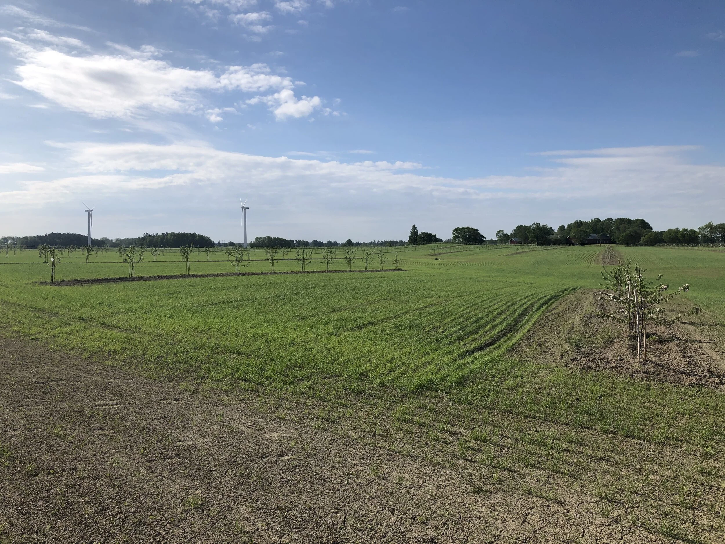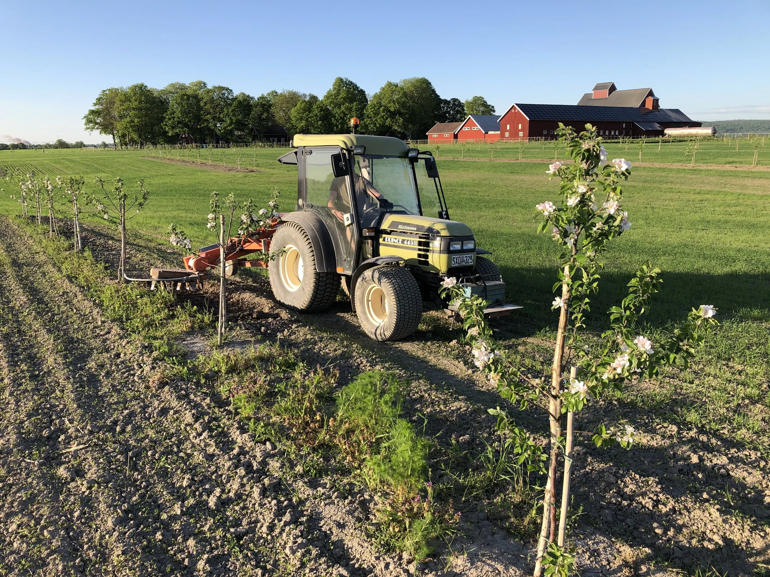 Våra äppleträd beställde vi november 2017 och planteringen av de cirka trettio sorterna gjordes i maj 2020. Vi har valt sorter med senare mognad, för att ha möjlighet att skörda spannmålen som växer mellan äpple raderna. Odlingen är ekologisk och KRAV certifierad.